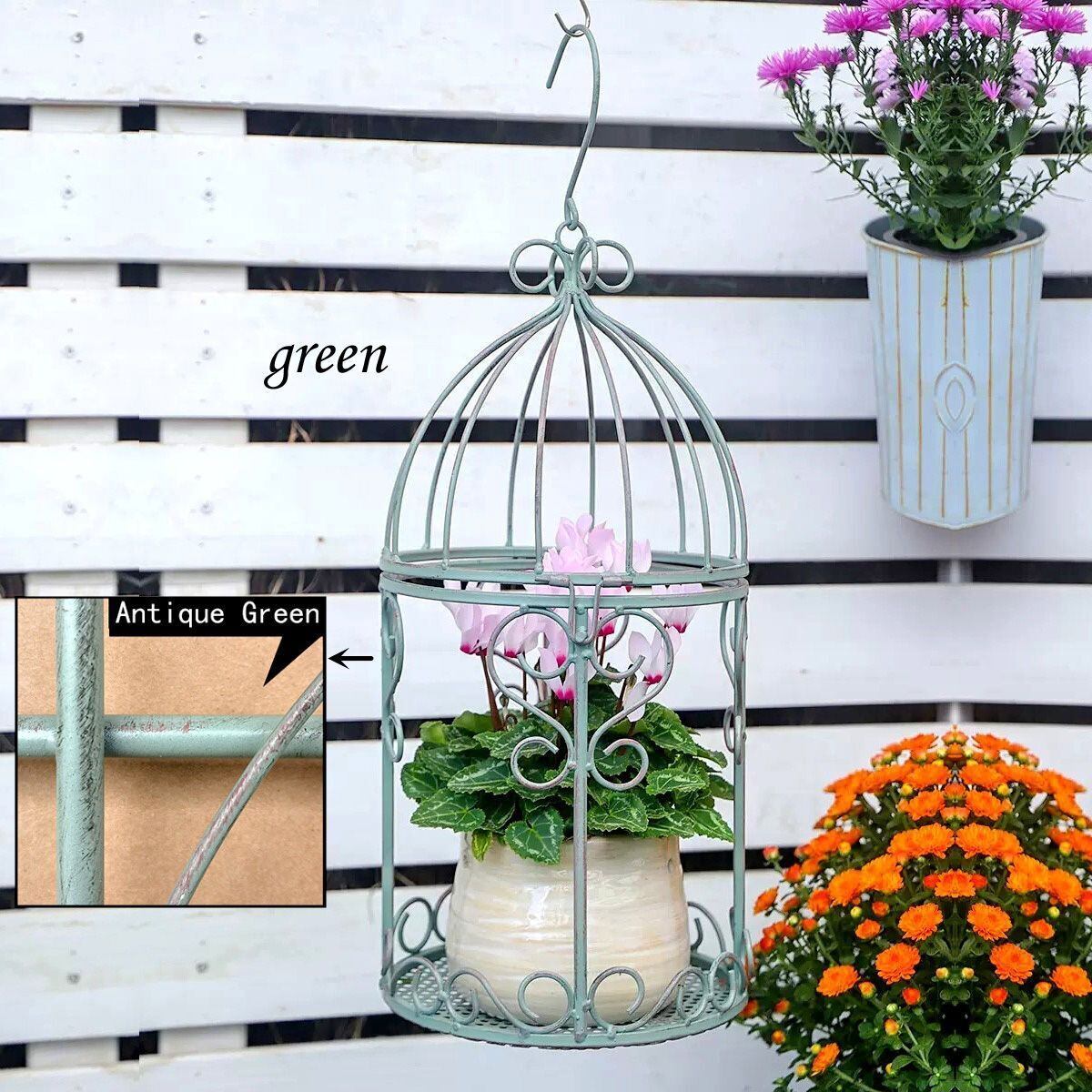 プランターバスケット ハンキング ヴィンテージ調 シャビー加工 ホワイト グリーン バスケット 白 緑 シャビーシック レトロ ガーデニング 雑貨 ガーデン雑貨 ガーデンインテリア ガーデン インテリア 庭の装飾 お洒落 おしゃれ 8-14