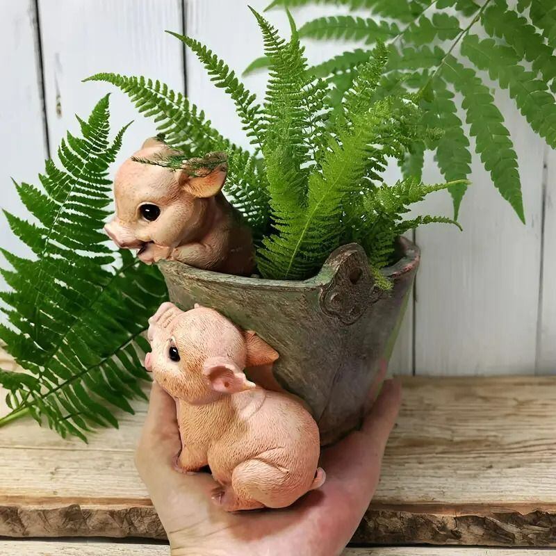 ビビッドなカラーとリアルな表情が特徴の「ブタのプランター」は、愛らしいデザインが魅力のアイテムです。この樹脂製プランターは、2匹のブタが愛らしく、飾るだけで温かみのある雰囲気を演出してくれます。