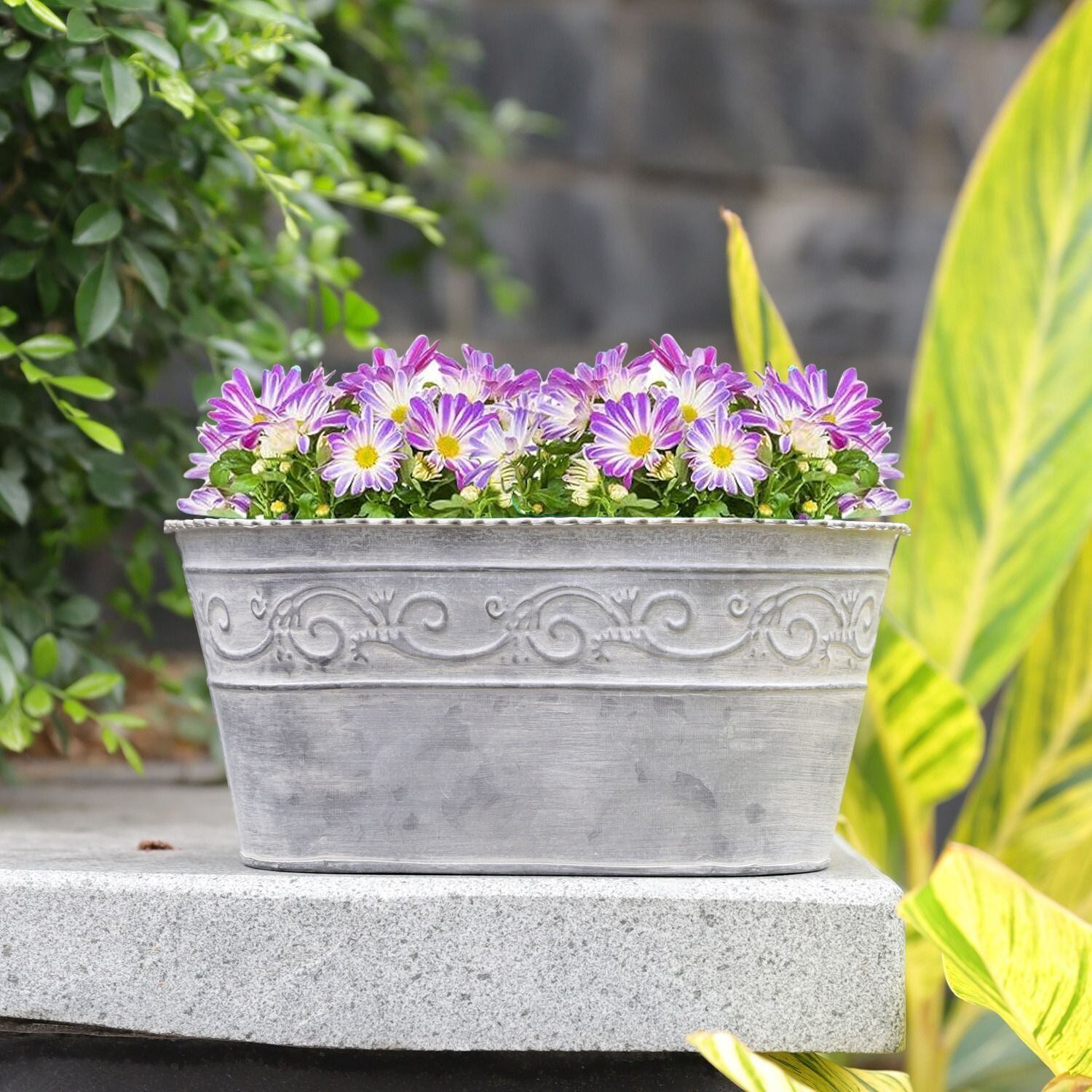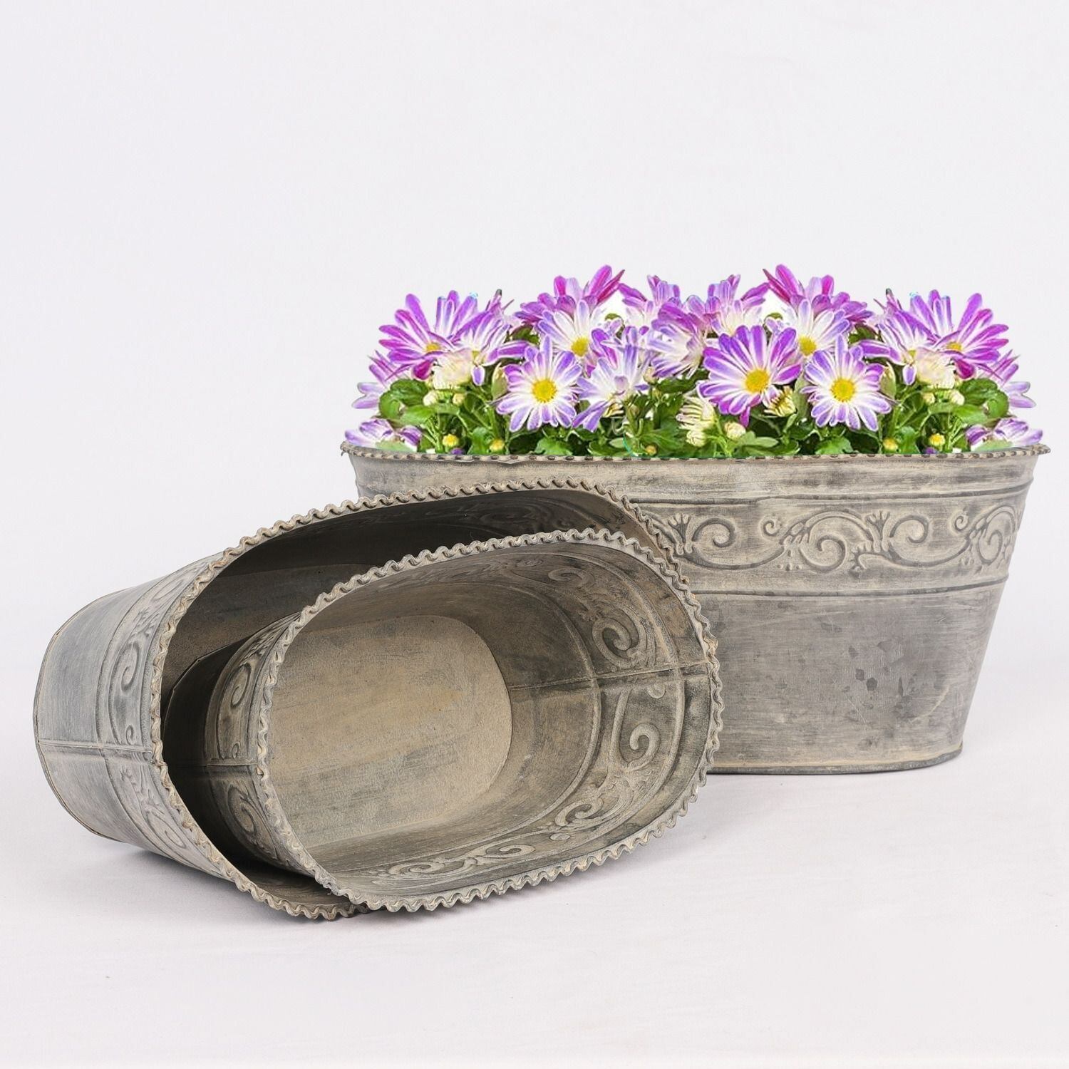 こちらの商品は、ヴィンテージ調のデザインが特徴の魅惑的なアイテムです。異なる3サイズのプランターは、あなたの植物を美しく引き立てる魅力があります。その亜鉛メッキ素材は耐久性にも優れ、長く愛用していただけることでしょう。