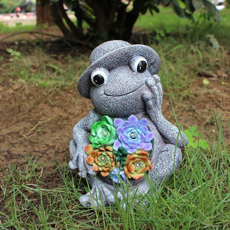 樹脂製のため、軽量で持ち運びも簡単。どんな場所にもフィットし、耐久性も優れているため、外での使用にも適しています。昼間はソーラー充電し、日が沈むころには柔らかな光を放ち、夜の空間を優しく演出します。カエルの表情や帽子のデザインが特に魅力的で、見る人を笑顔にすること間違いなしです。