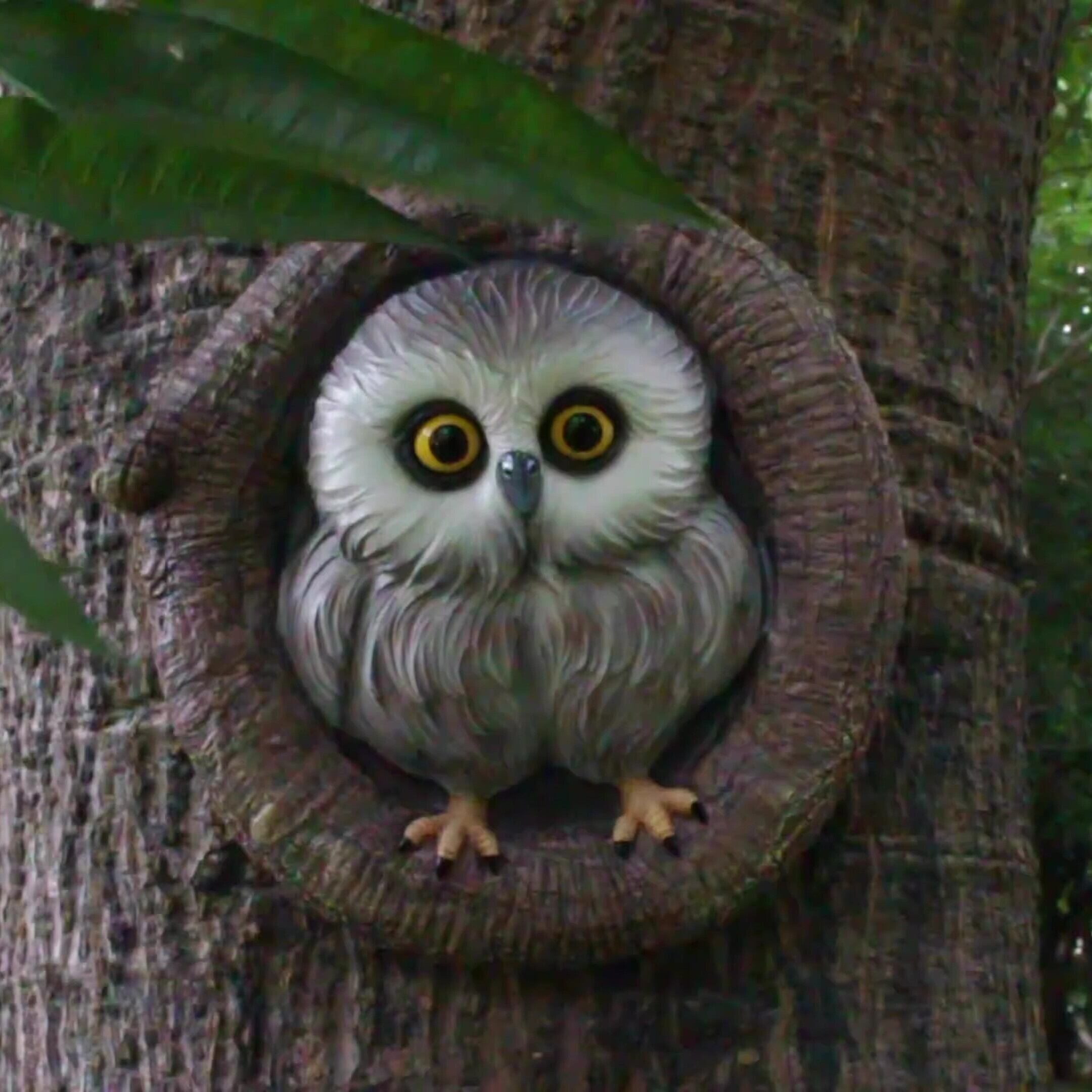 樹脂製のこのフクロウは、軽量で耐久性があり、屋外に取り付けて楽しむことができます。リアルな質感と丁寧な彩色が施されており、まるで本物のフクロウが木に宿っているかのような存在感を感じさせます。ガーデンやバルコニー、さらには室内のインテリアとしてもおしゃれに映えます。