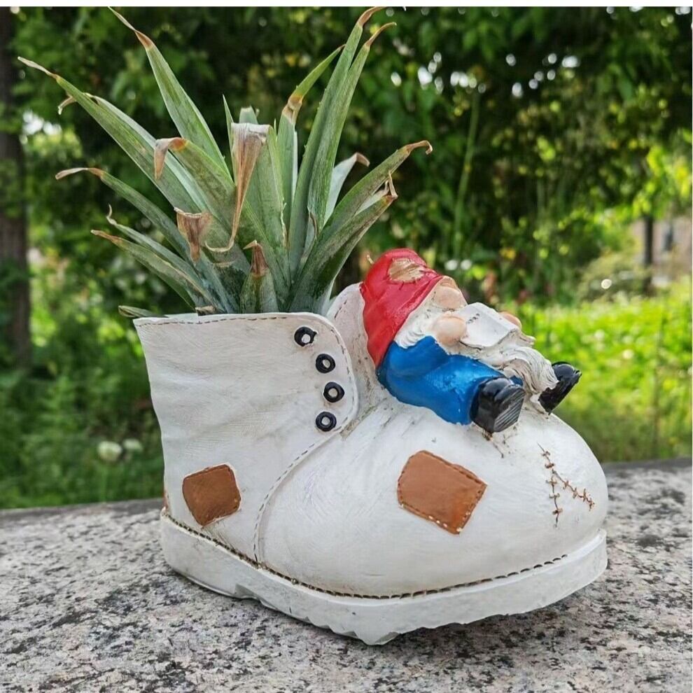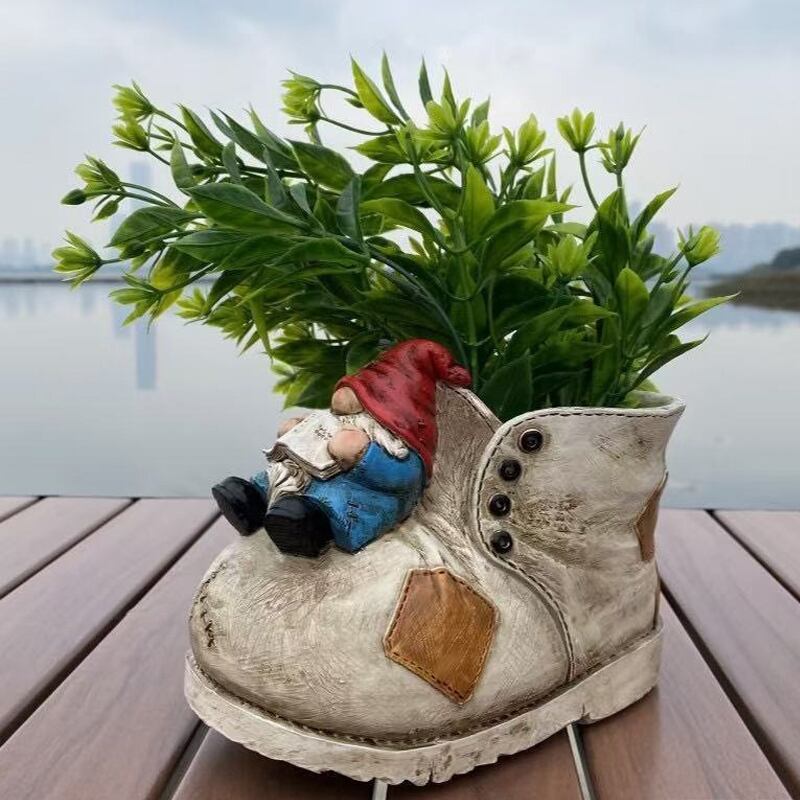 靴の上で愛らしく寝そべる小人の姿が特徴的なこのプランターは、観る人すべてに笑顔をもたらすユニークなアイテムです。庭やベランダに置くだけで、温かみのある雰囲気を演出。まるで小人があなたの植物とともに成長を見守っているかのようです。このプランターは、花や小さな観葉植物を育てるための理想的な空間を提供します。