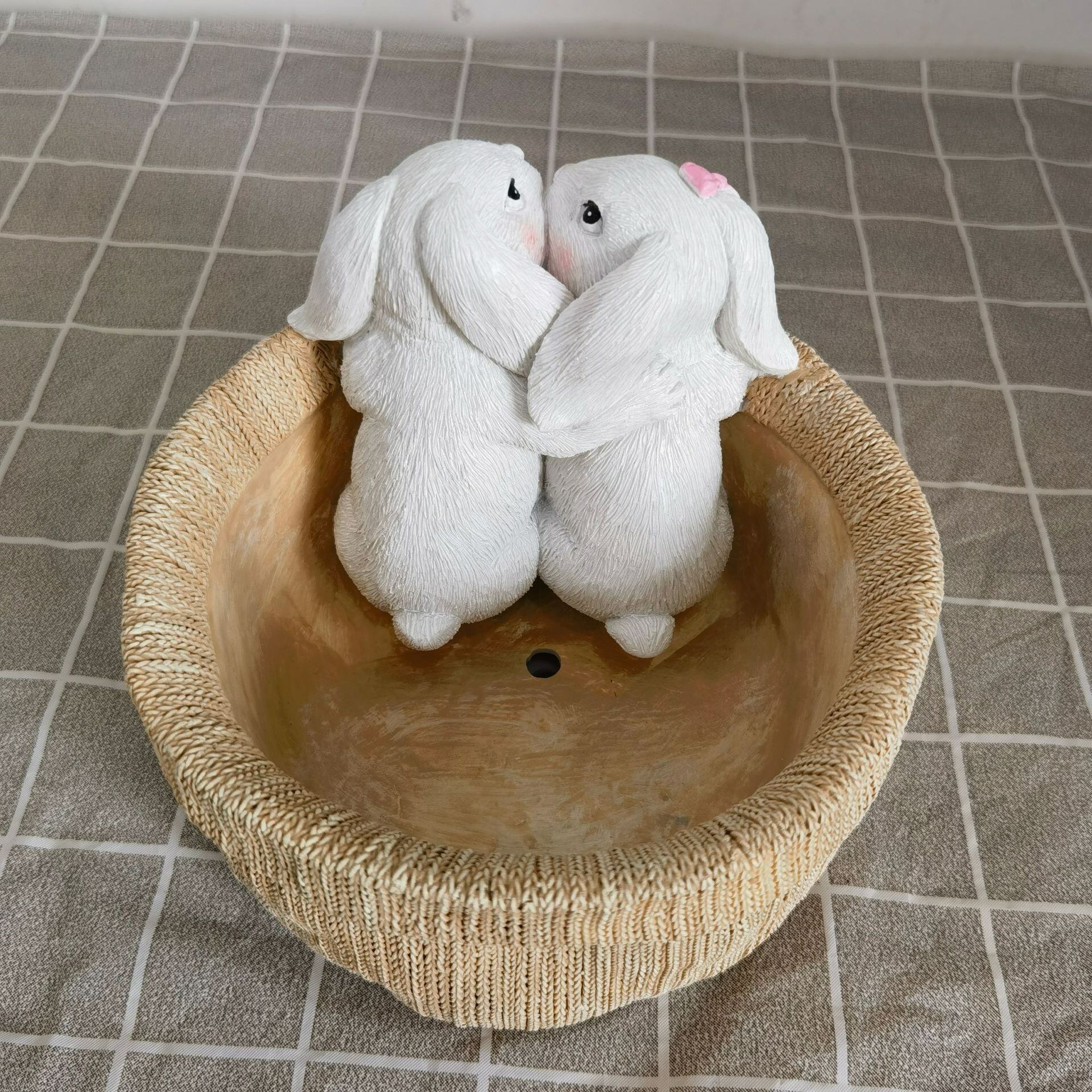 愛らしい2匹のうさぎをモチーフにしたこのプランターは、可愛らしさと優雅さを兼ね備えた素敵なインテリアアイテムです。1匹はピンクのリボンを着けており、特別な存在感を放っています。うさぎは繁栄や幸福の象徴として愛されており、そのデザインは見る人に温かい気持ちをもたらすことでしょう。