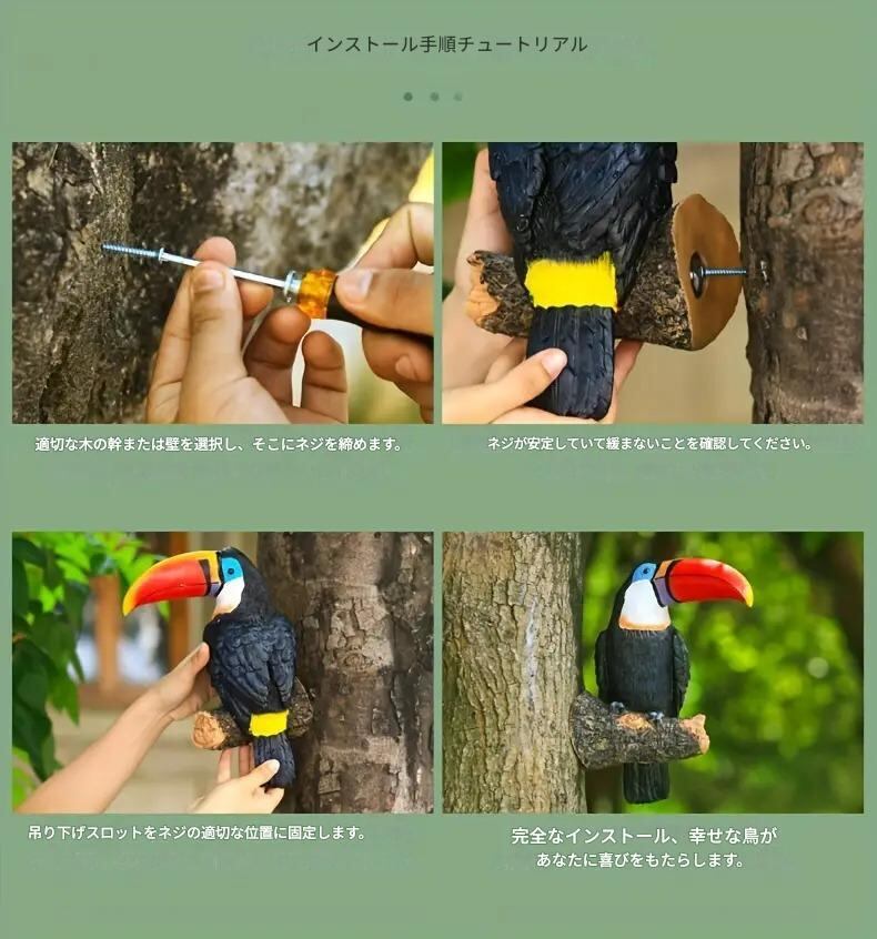 壁や木に飾ることで、より一層の魅力を引き出し、庭やバルコニーを華やかに演出します。このアイテムは、あなたの大切な時間を彩り、穏やかなリラックス空間を提供してくれるでしょう。また、友人や家族への贈り物としてもおすすめで、特別な瞬間に寄り添う存在となります。このオオハシのガーデンオブジェが、あなたの暮らしに笑顔と喜びをもたらすきっかけとなれば幸いです。