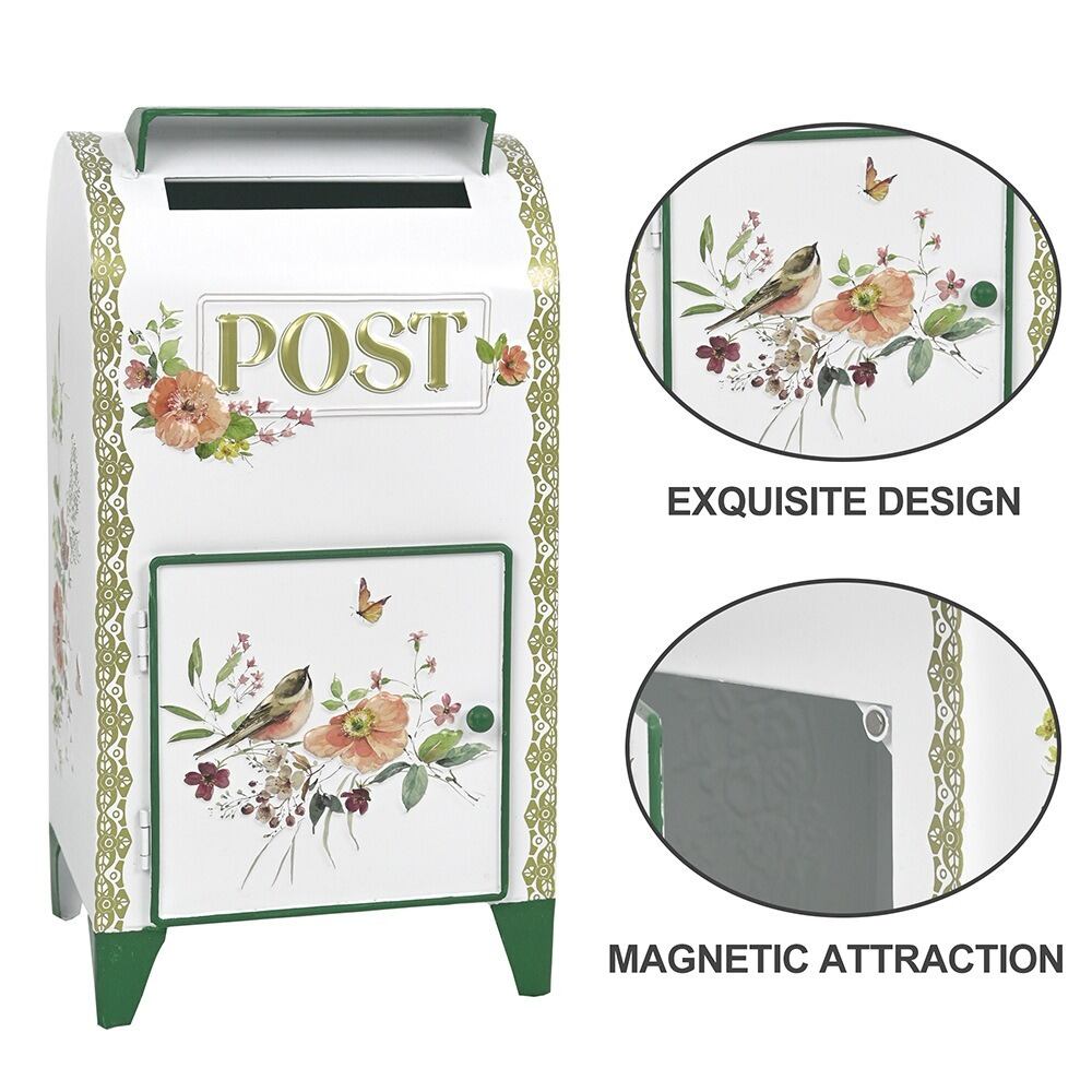 こちらの置き型ポストは、ヨーロッパスタイルのデザインが特徴的で、美しい鳥と花の絵柄が施されています。重厚感のある鉄素材で作られているため、耐久性が高く、長年にわたってご利用いただけます。特に、洗練された花の絵は、庭に彩りを添えるだけでなく、訪れる人々に優雅な印象を与えてくれることでしょう。