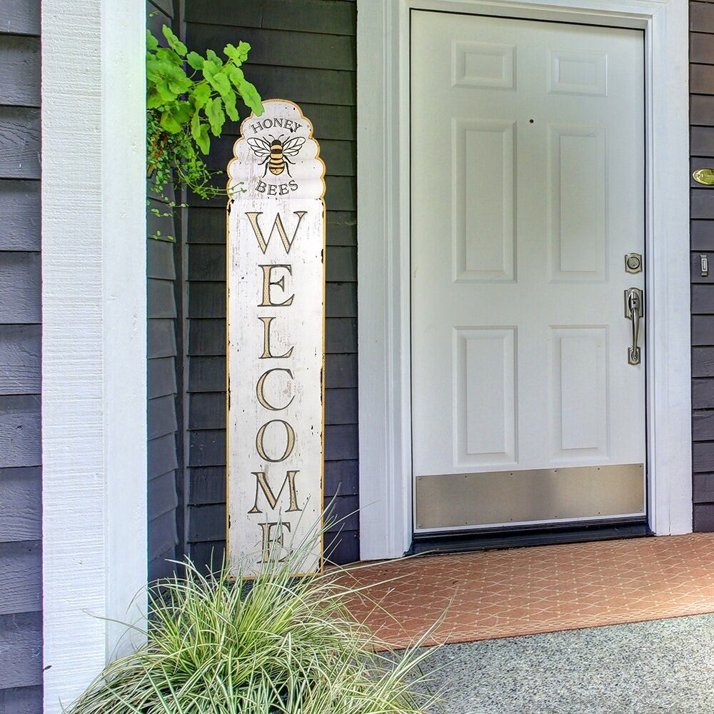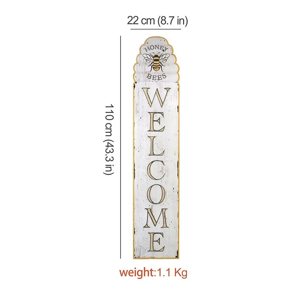 無垢材を使用したガーデンサインは、ヴィンテージ調のデザインが特徴で、「WELCOME」の文字と蜂のイラストが施された一品です。このサインは、庭やガーデンエリアに温かみを加え、訪れる人々に心地よい雰囲気を演出することができます。