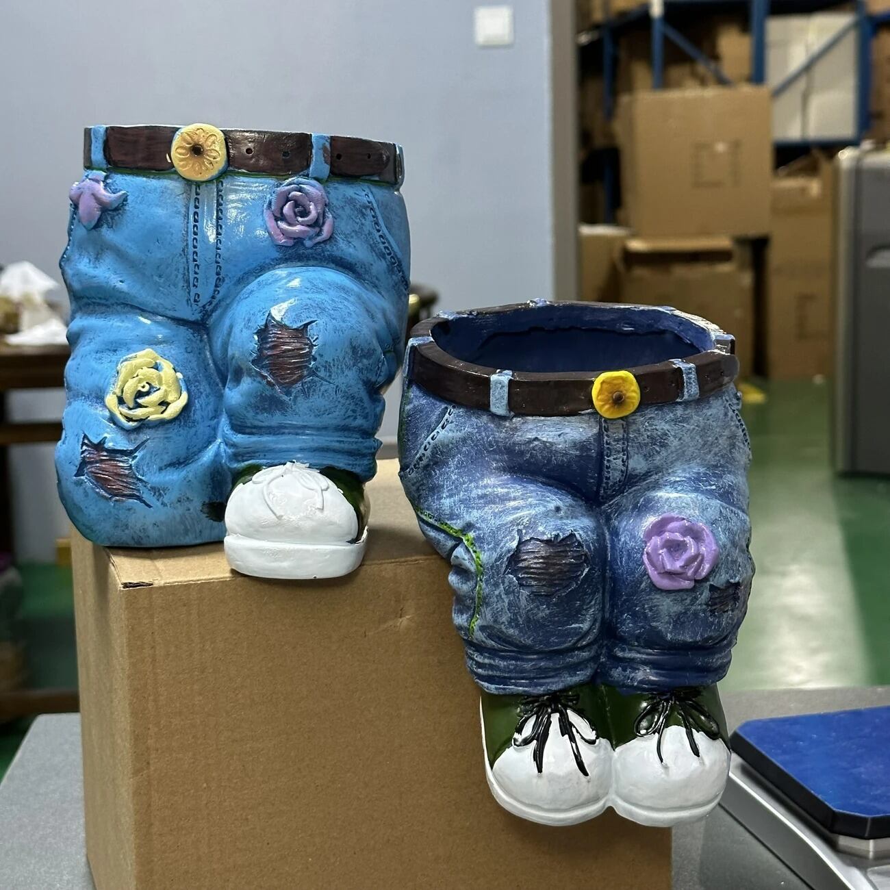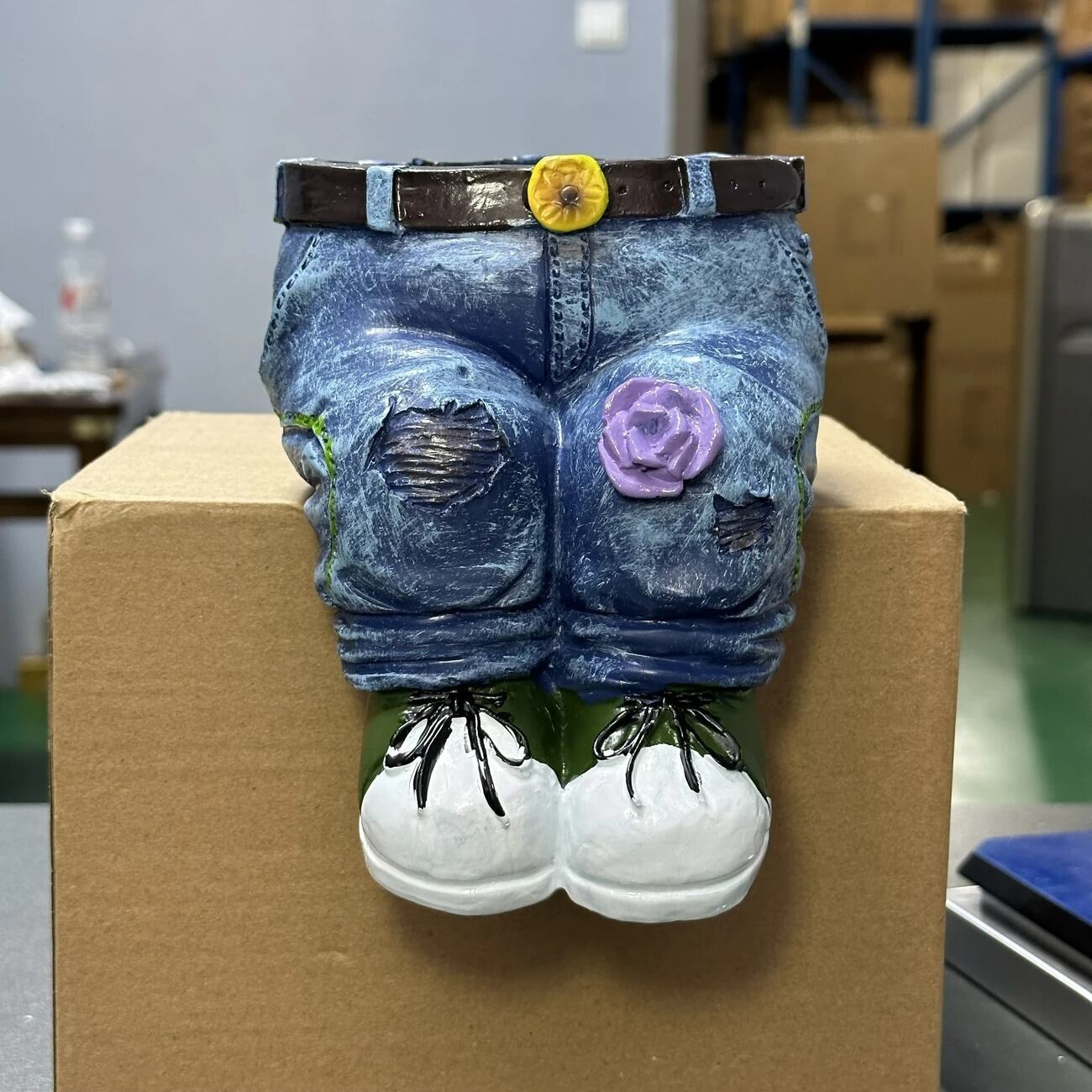 こちらは、ユニークなズボンデザインのプランターです。樹脂素材で作られており、軽量ながらも耐久性がありますので、屋外で安心してご使用いただけます。このプランターは、楽しいデザインが特徴で、訪れる人々に笑顔をもたらすことでしょう。