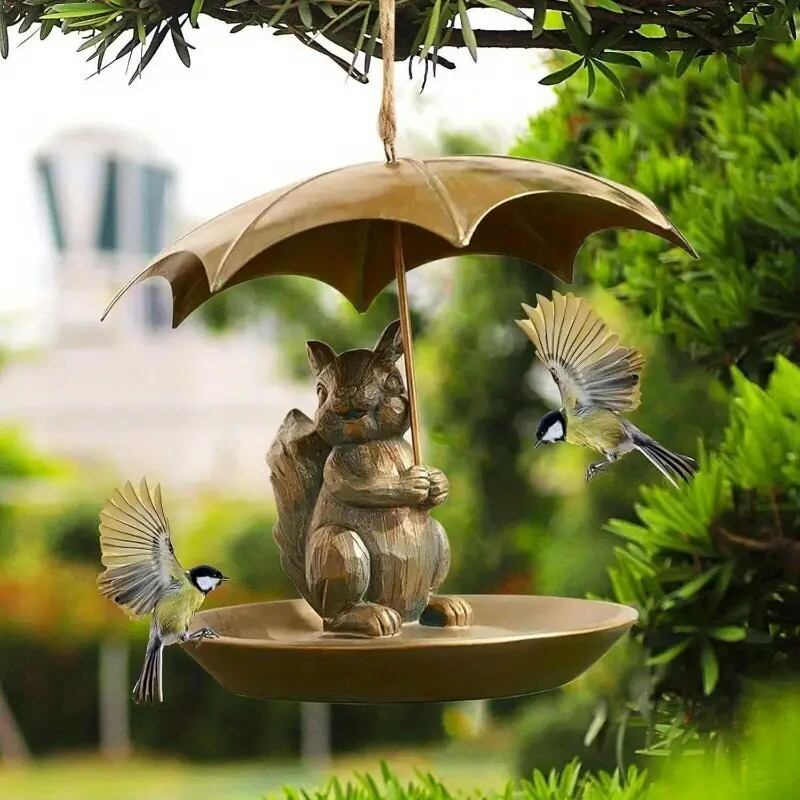 シードを簡単にセットできるスペースがあり、すぐに野鳥たちが訪れるのを楽しむことができます。リスと傘の愛らしいデザインが、まるで庭の隅で待っているかのように感じられるでしょう。