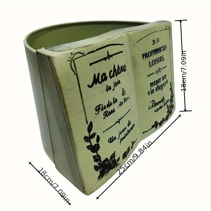 こちらの鉄製プランターは、ヴィンテージ調のシャビー加工が施された逸品です。フランス語の文字が刻まれた本のデザインが特徴的で、クラシカルな雰囲気を醸し出します。古い本をモチーフとしたこのプランターは、ガーデニングやインテリアのアクセントとしても大変魅力的です。