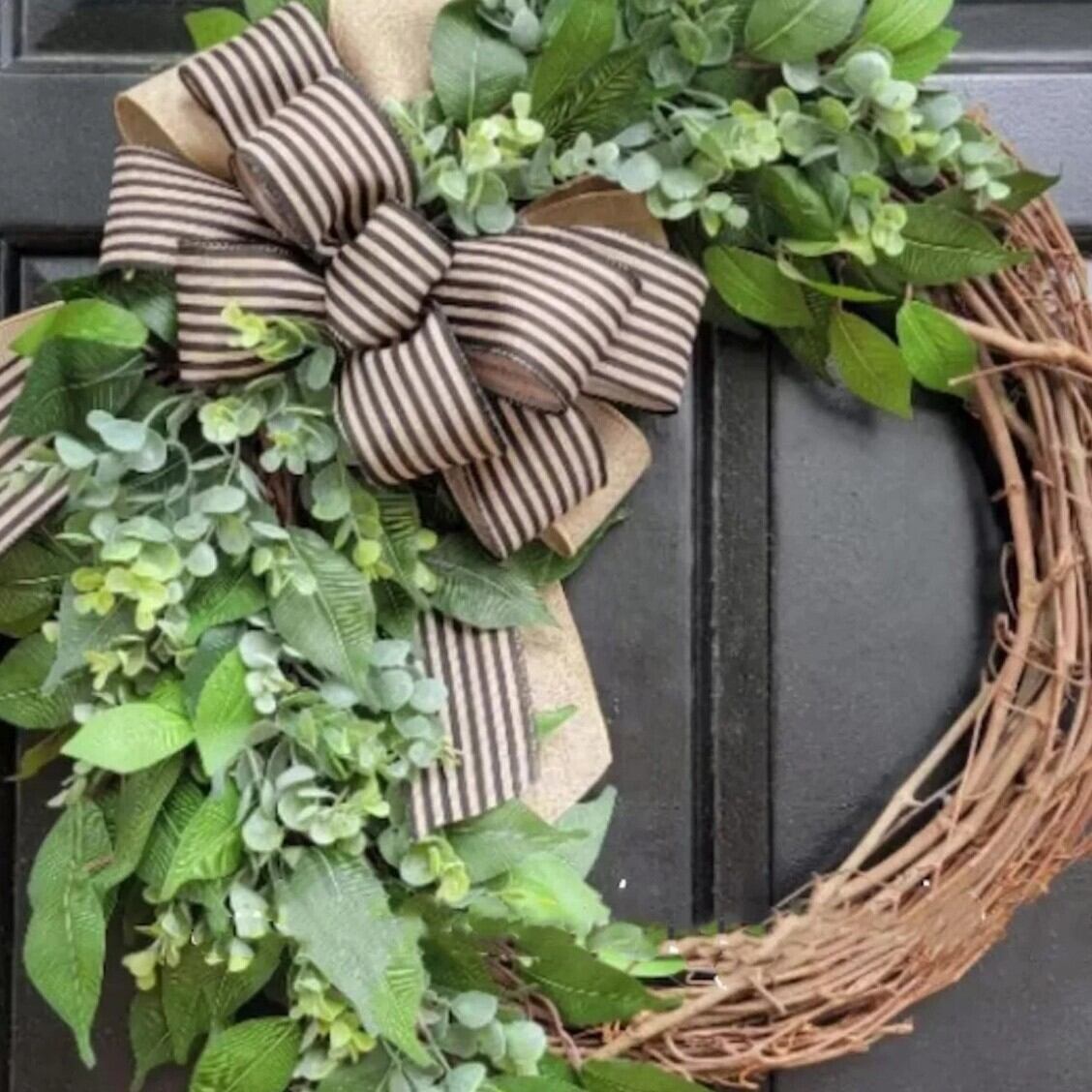 こちらは、優雅で美しいデザインの「ユーカリのリース 」です。このアイテムは、あなたの玄関やガーデンを華やかに演出することができるリースです。心地よい風合いと温もりを感じさせる仕上がりが特徴です。