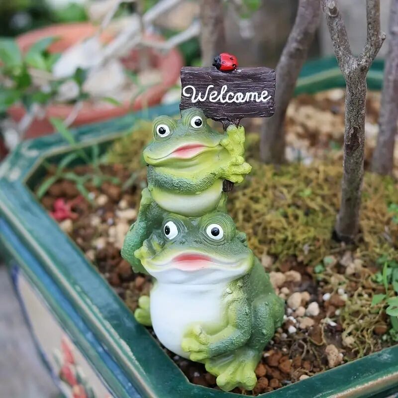 愛らしいカエルの親子があなたの庭や玄関に温かみと楽しさをもたらしてくれます。このユニークなウェルカムサインは、訪れる人々に素敵な印象を与え、自然の中でのリラックスした雰囲気を演出します。