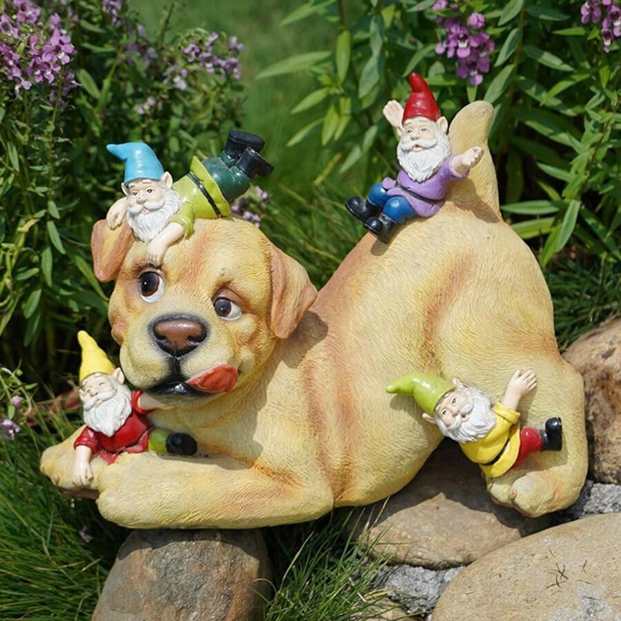 樹脂製のこのオブジェは、屋外でも安心して使用できる耐候性に優れた素材で作られており、非常に軽量ながらも、しっかりとした作りが特徴です。細部にわたるデザインは緻密で、愛くるしい表情の犬とおしゃれな服装をしたノームが、あなたの庭に温かみと楽しさを添えてくれます。