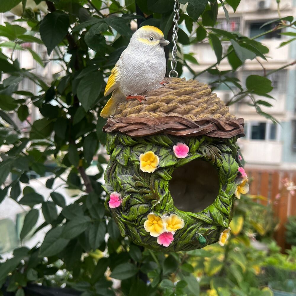 このバードハウスには、可愛らしい小鳥のオブジェが付いており、庭の景観に憩いのアクセントを加えます。自然素材を意識したデザインは、環境にも優しく、風に揺れる姿がほっこりとした気持ちにさせてくれます。小鳥の囀りを聞きながらのバードウオッチングは、リラックスや癒しのひと時を提供してくれることでしょう。