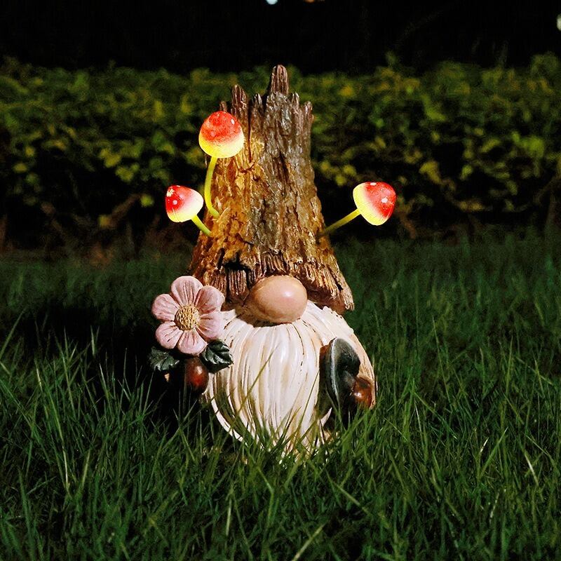 このノームは、帽子にキノコが生えたユニークなフォルムを持ち、その姿は見る人に微笑みをもたらします。庭のアクセントとしてだけでなく、バルコニーやベランダの飾りとしても大変おすすめです。特に夜風に当たって灯る柔らかな光は、リラックスしたり、心温まるひとときを演出してくれるでしょう。