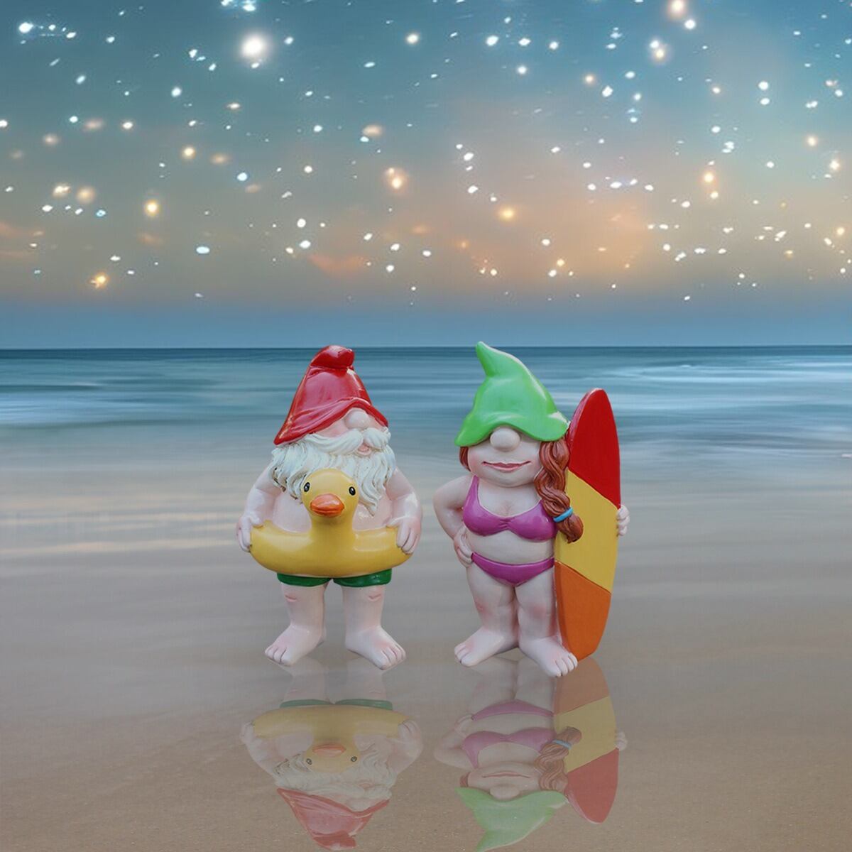 このオブジェは、耐久性に優れた樹脂素材を使用しており、屋外でも安心してご利用いただけます。色あせや割れの心配がなく、長期間その魅力を保ちつつ、あなたのガーデニングライフをより豊かに彩ります。水着姿のノームたちが、見る人々の心をほっこりとさせ、楽しいひとときを提供してくれる素敵な存在となることでしょう。