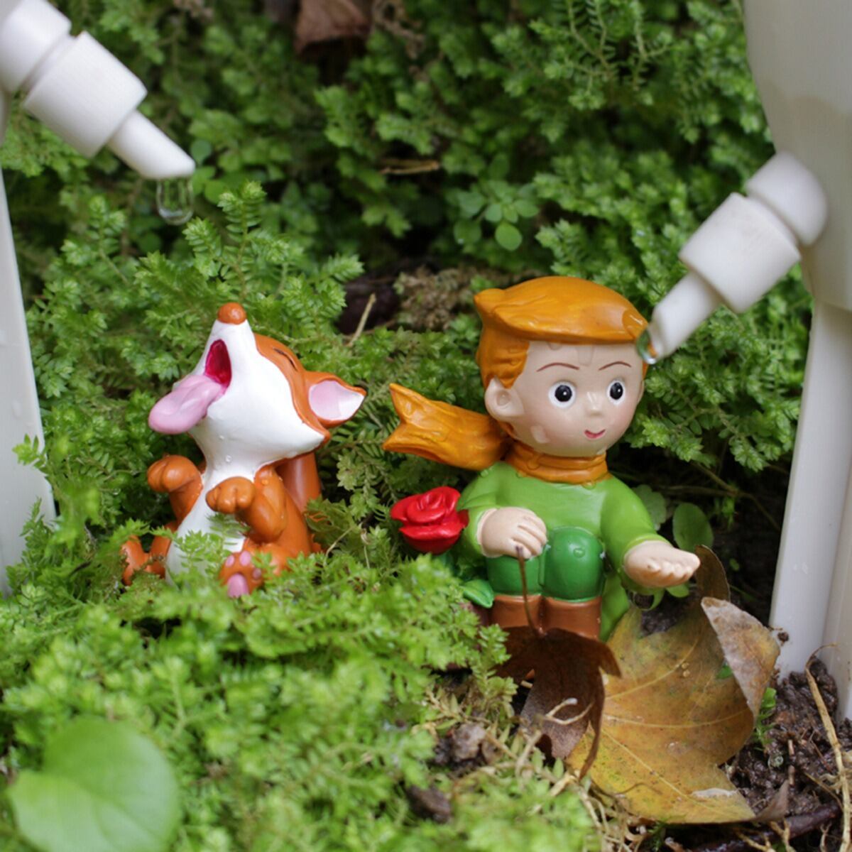 この自動水やり器は、長期間の旅行などでも安心してお使いいただける機能性を兼ね備えています。水分を必要とする植物に自動的に水を供給し、手間を省きながら美しい庭を維持することが可能です。王子様とキツネの愛らしい姿が、見る人々の心を癒し、楽しいひとときを提供する素敵な存在となることでしょう。