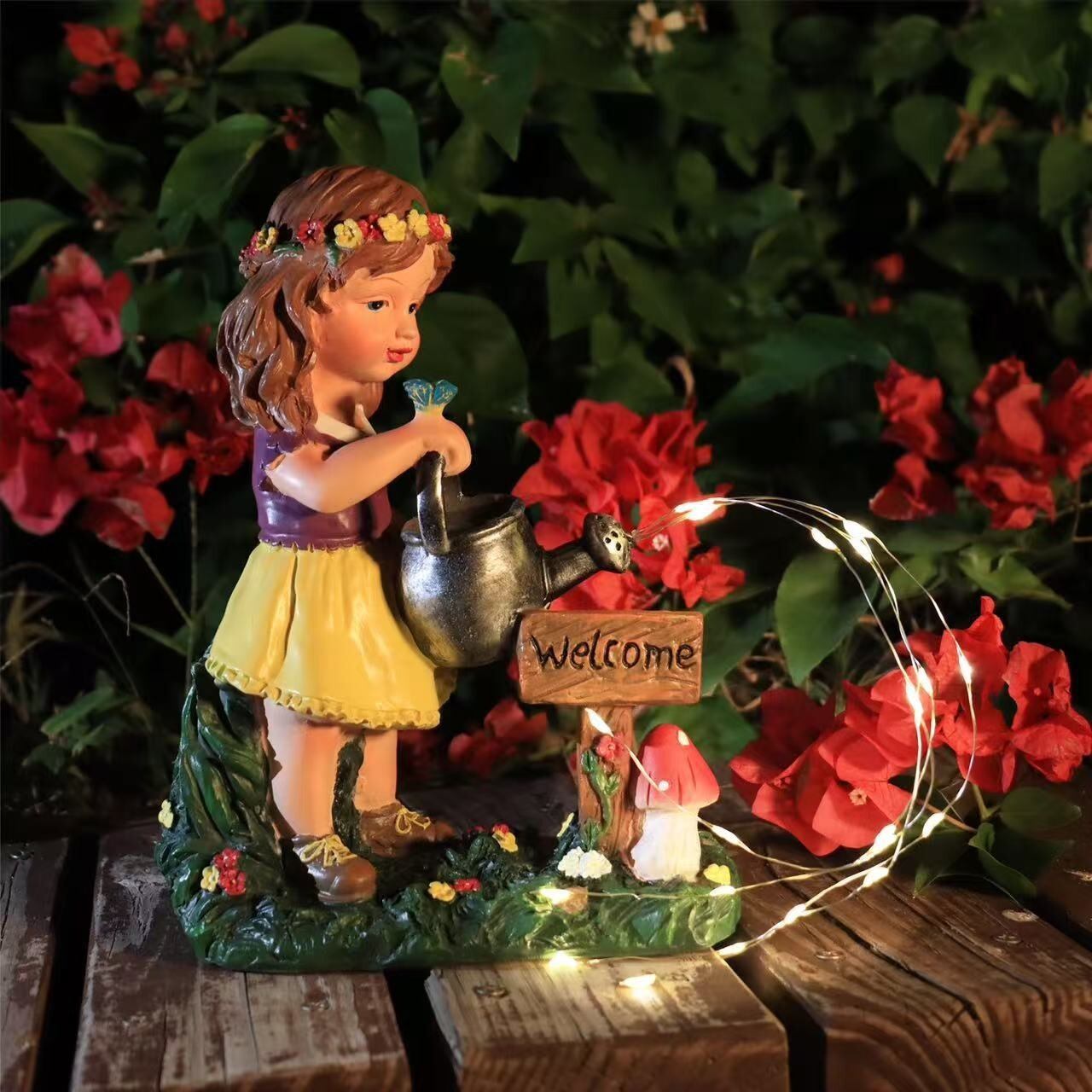 このガーデンライトは、女の子がお花に水をあげているようなかわいらしいデザインが特徴の特別なアイテムです。優しい印象を与えるこのライトは、ガーデンやバルコニーに華やかさをプラスし、訪れる人々に微笑みをもたらします。暖かな光で、豊かな自然を感じさせる空間作りに寄与するでしょう。